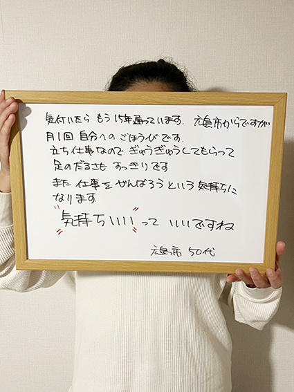 立ち仕事で足腰が痛くてこちらへ来ました。最初はリンパマッサージが痛く感じましたが、施術後は足が軽く身体全体がスッキリしました。もう3年通っています。これからも月1通いま〜す!